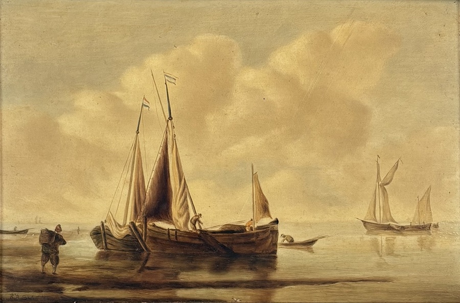 Schilderij toont een maritiem tafereel met zeilboten langs een rustige kustlijn, uitgevoerd in olieverf op paneel. De compositie is opgebouwd met een centrale boot en lage horizon, terwijl een breed uitgewerkte luchtpartij het beeld domineert. Linksonder gemonogrammeerd, het schilderij dateert uit eind 19e eeuw en heeft een Noord-Europese herkomst.