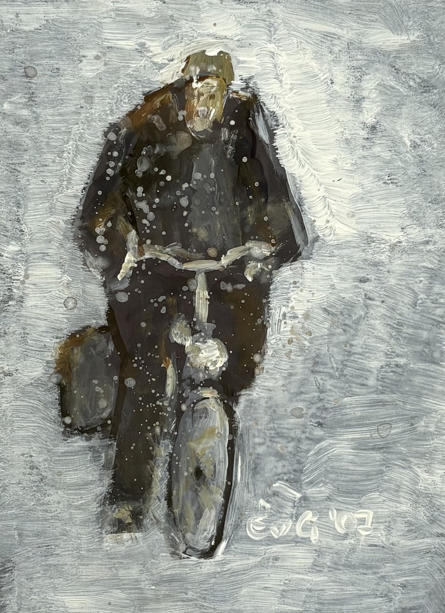 932. Olieverfschilderij, Els van Gelderen – fietser in de sneeuw, 2007