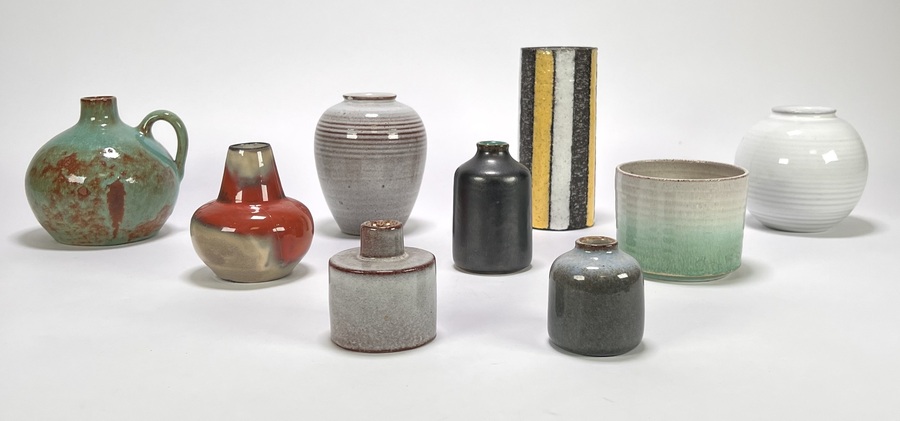 Verzameling keramiek van Westraven Utrecht en DOK, vervaardigd uit keramiek met diverse glazuurtechnieken. De collectie van elf vazen en kannetjes toont kenmerkende Utrechtse ontwerpen, waaronder een cilindrisch model met grafische verticale lijnen, een vaasje DOK. Datering midden 20e eeuw en een Nederlandse herkomst.