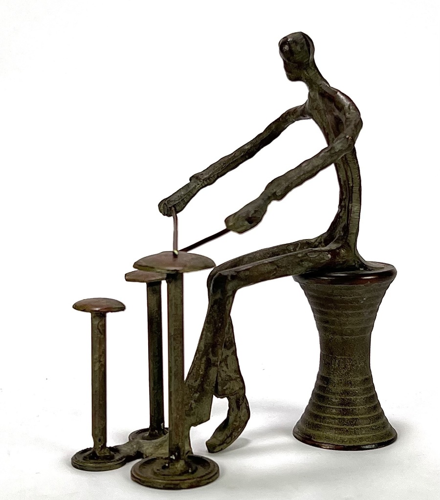 Beeld in modernistische stijl, vervaardigd uit messing met cire-perdue gietwerk. Het beeld toont een zittende trommelaar met gestileerde, draadachtige ledematen, een conische kruk en drie cilindrische trommels op ronde voeten. Datering tweede helft van de 20e eeuw, herkomst waarschijnlijk West-Afrika.