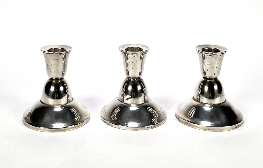 Drie zilveren 835/1000 kandelaren uitgevoerd als lage exemplaren met gewelfde ronde voet, ingesnoerde balusterschacht en uitlopende kaarsvetvanger. De kandelaren hebben een verzwaarde voet, gemerkt met zwaardje, datering tweede helft 20e eeuw.
