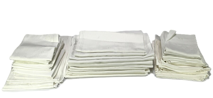 Tafelgoed van damast in traditionele stijl, vervaardigd uit wit geweven textiel met florale en geometrische patronen. Het lot bevat diverse servetten en tafellakens met glanzende weefstructuur en afgewerkte zomen. De collectie toont een variatie in afmetingen, datering 20e eeuw en een Europese herkomst.