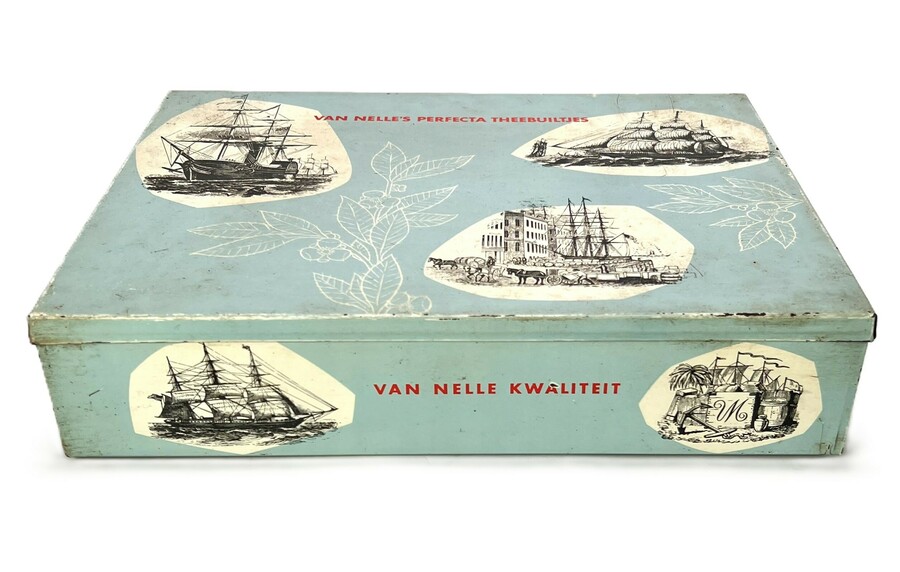 Reclameblik van Van Nelle uit de Art Deco periode, vervaardigd uit gelithografeerd blik met afbeeldingen van stoomschepen. De voorstellingen tonen de vloot van de Rotterdamse firma. Hierbij een zilverkleurig maliënkolderbeursje, een suikerschep en een theelepel. Datering eerste helft 20e eeuw en een Nederlandse herkomst.