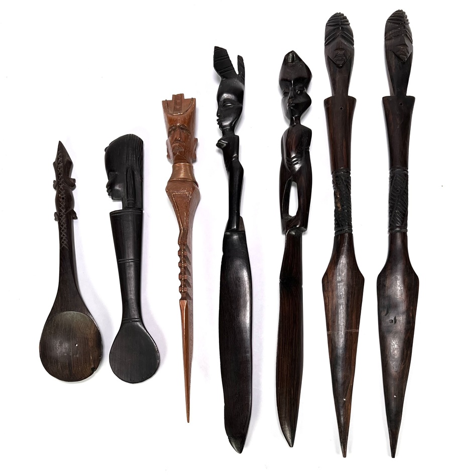 Makonde bestek uit Tanzania, tweede helft 20e eeuw, vervaardigd uit handgesneden ebbenhout. Het zevenledige convoluut omvat lepels, vorken en een messen met handgrepen in de vorm van menselijke figuren.