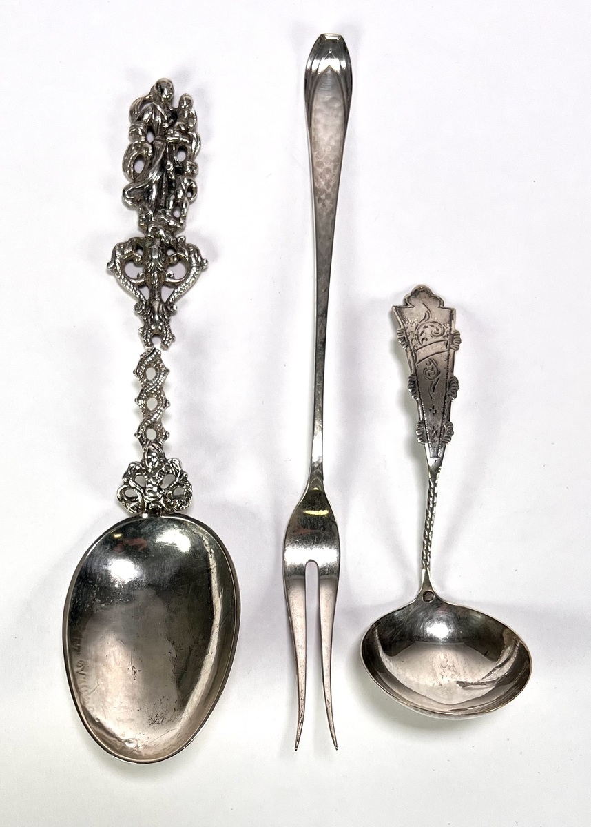 Zilveren geboortelepel, roomlepel en vork, de geboortelepel draagt de gegraveerde inscriptie “Jelger Jetzes Kuipers is geboren den 2 julij 1822”, de roomlepel heeft een opengewerkte steel met gegoten apostelfiguur en de slanke vork een sober taps toelopend model. Datering 19e/20e eeuw, herkomst Nedeland.