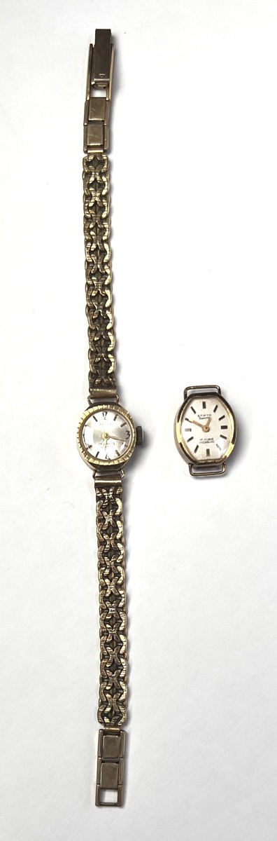 Twee gouden dameshorloges met 14 karaat geelgouden kasten, gemerkt 14K en het 0,585 gehalteteken. De dameshorloges zijn voorzien van mechanische uurwerken en hebben diverse wijzerplaatconfiguraties met Arabische cijfers en indexen. Inclusief een goudkleurige horlogeband van onedel metaal. Europese herkomst, midden 20ste eeuw.