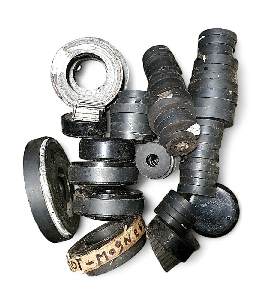 Lot magneten in diverse uitvoeringen, vervaardigd uit ferriet en metaal met kunststof. De verzameling omvat uiteenlopende vormen, waaronder ringmagneten en cilindrische elementen voor industriële of educatieve toepassingen. Datering tweede helft 20e eeuw.