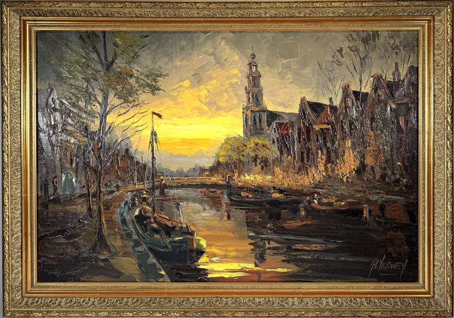 Schilderij door A. Verwey toont een Amsterdams stadsgezicht met de Westerkerk in impressionistische stijl, uitgevoerd in olieverf op doek. De compositie toont de Prinsengracht bij zonsondergang met een tjalk op de voorgrond. Rechtsonder gesigneerd, het werk dateert uit circa 1950 en heeft een Nederlandse herkomst. Voorzien van goudkleurige lijst.