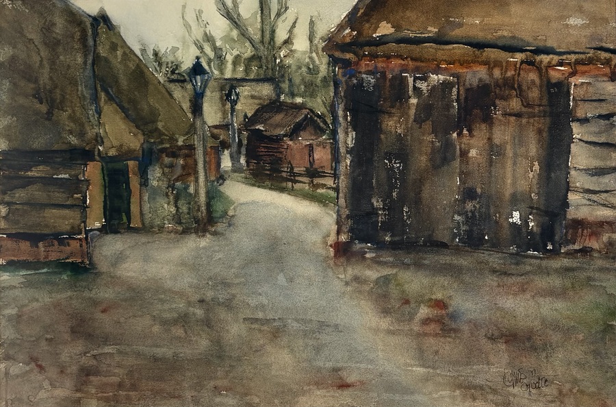 Aquarel in impressionistische stijl toont een dorpsgezicht met houten schuren, uitgevoerd in aquarel op papier. Rechtsonder onduidelijk gesigneerd, het werk dateert uit circa 1920 en heeft een Nederlandse herkomst. Geplaatst in een houten lijst.