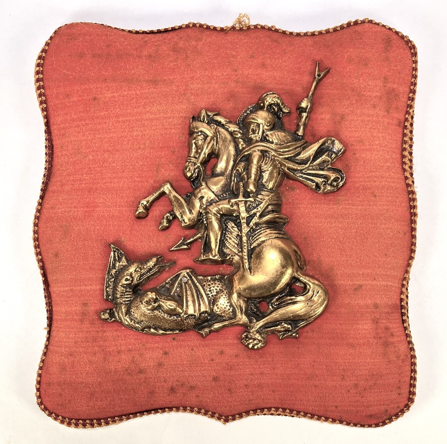 Wandplaquette uit de neobarokke traditie, vervaardigd met een gegoten metalen reliëf op een beklede plaquette van rood textiel. Centraal is Sint-Joris te paard afgebeeld terwijl hij een draak doorboort, uitgewerkt met plastische details in wapenrusting, paard en monster. Daterend uit de tweede helft 20e eeuw, een Zuid-Europese herkomst.