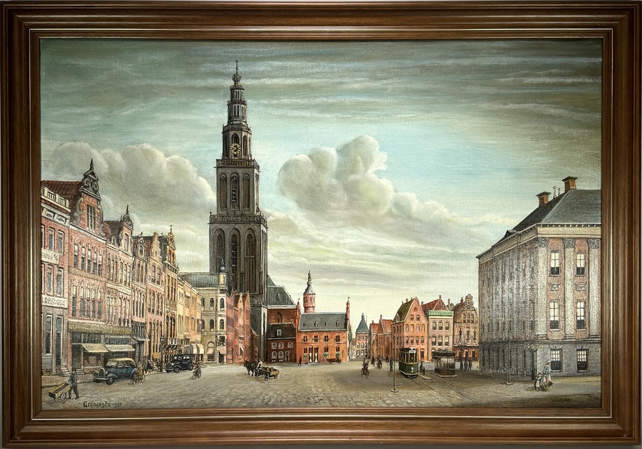 Schilderij van T. Timmer toont een panoramisch gezicht op de Grote Markt te Groningen in topografisch realistische stijl, uitgevoerd in olieverf op doek. De compositie centreert de Martinitoren en toont historische stoffage van een tram, oldtimers en passanten. Rechtsonder gesigneerd en linksonder getiteld "Groningen 1927". Midden 20e eeuw, Nederlandse herkomst. Voorzien van een klassieke geprofileerde houten lijst.
