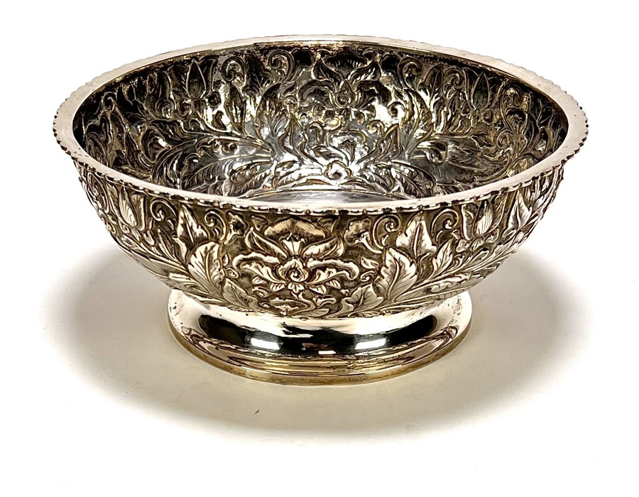 Schaal uit de Art Nouveau periode, circa 1930, vervaardigd uit 800/1000 zilver. De ronde schaal op voet toont een rijk gedreven decoratie met lotusbloem-motieven en tropische florale ornamentiek. De onderzijde is voorzien van de letters MD en het gehaltestempel 800. De schaal vertoont kenmerkend Javaans handwerk uit de koloniale periode en heeft een herkomst in Nederlands-Indië.