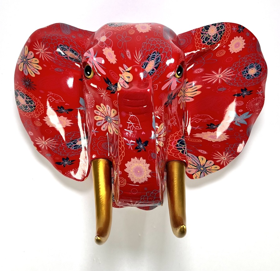 Wandobject in de vorm van een olifantenkop "Jim" in postmoderne stijl, vervaardigd uit kunststof met polychrome decoratie door Pomme Pidou. Het rode oppervlak toont een floraal patroon met gedetailleerde paisley-motieven en cirkelvormige ornamenten, met goudkleurige slagtanden en een glanzende afwerking. De olifant dateert uit de late 20e eeuw en heeft een Europese herkomst.