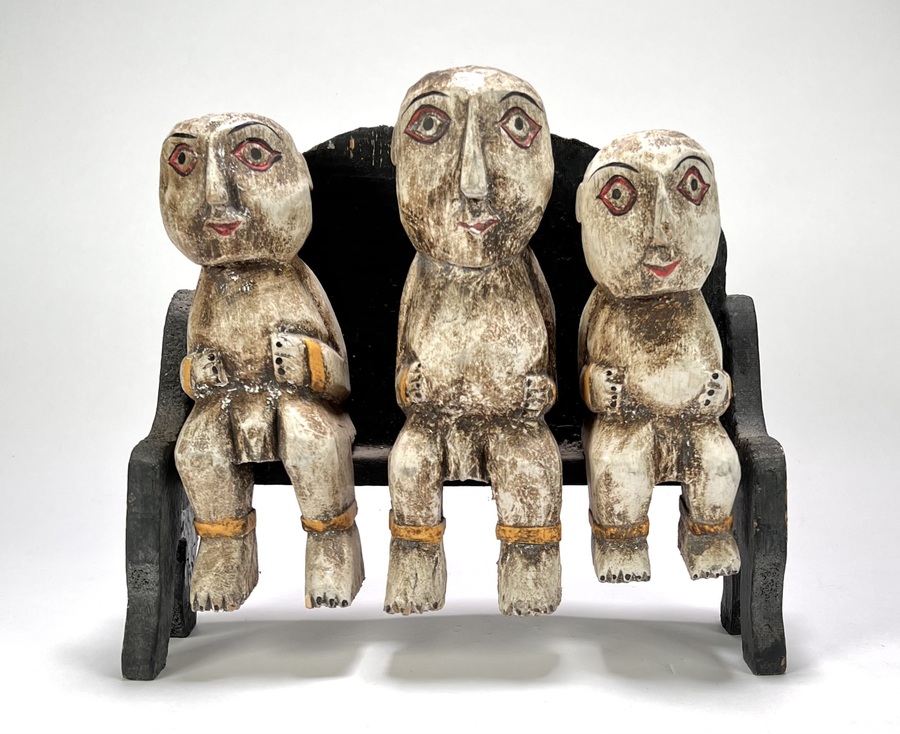 Beeld in tribale stijl, vervaardigd uit hout met handgesneden en polychroom beschilderde voorstelling van drie zittende figuren op een bank. De langgerekte hoofden met amandelvormige, rood omlijnde ogen en gestileerde handen rusten frontaal op de romp, geelkleurige banden accentueren polsen en enkels. Het beeld dateert uit de tweede helft van de 20e eeuw en heeft een West-Afrikaanse herkomst.