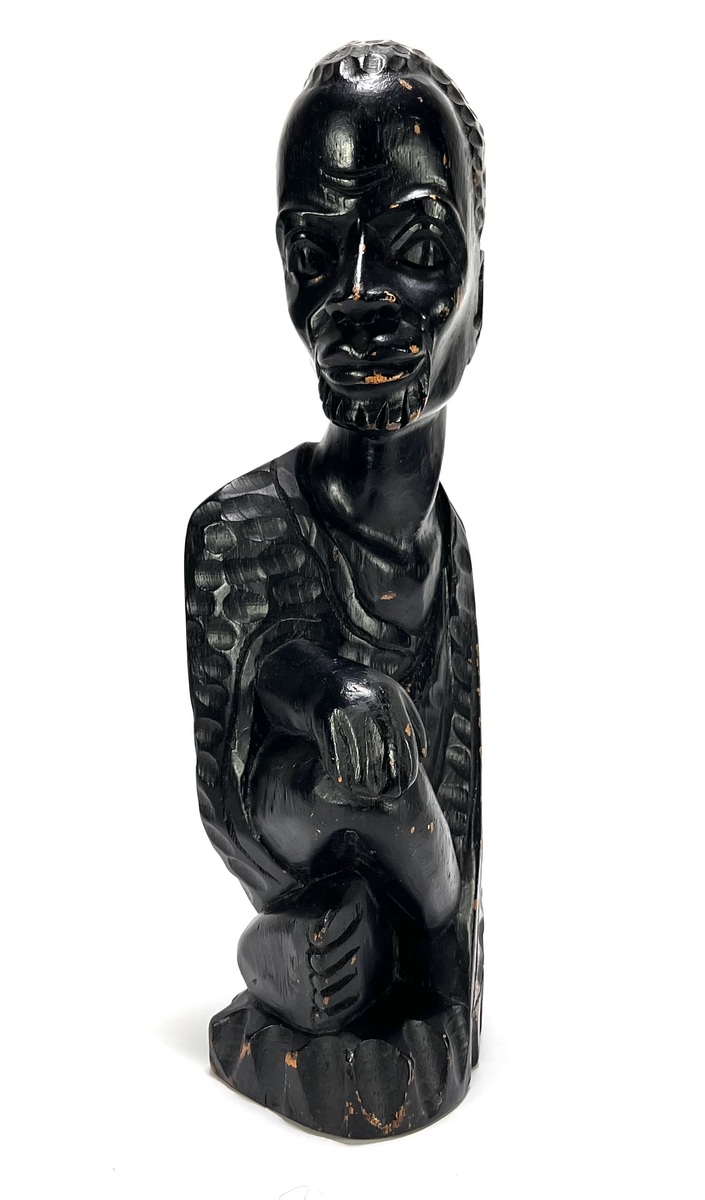 Makonde beeld uit Tanzania, eind 20e eeuw, uitgevoerd in massief ebbenhout. De zittende figuur toont een gestileerd gezicht met geprononceerde jukbeenderen, amandelvormige ogen en een karakteristieke geometrische coiffure. De rugzijde is gedecoreerd met een herhalend gepunt patroon.
