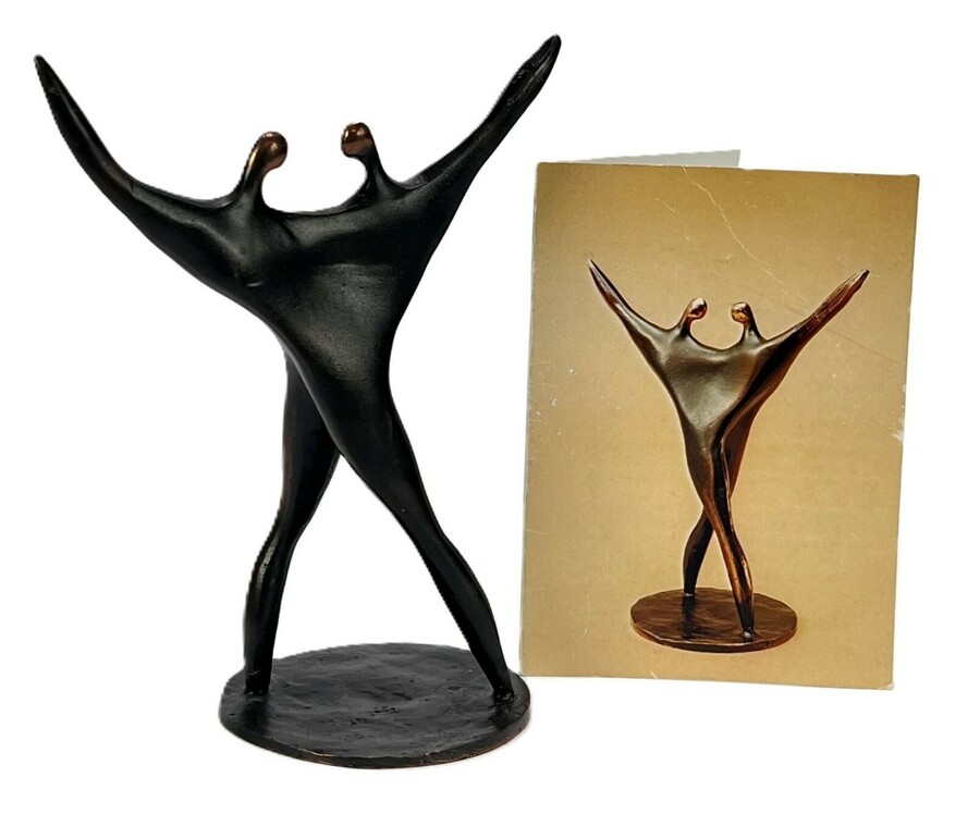 Beeldje door Mark Jurriëns getiteld “Samenwerken als één”, vervaardigd uit brons met een donkerbruine patina. Het beeld toont twee geabstraheerde dynamische figuren met omhoog reikende armen en gepolijste hoofden. Het beeld dateert van circa 2000 en heeft een Nederlandse herkomst.