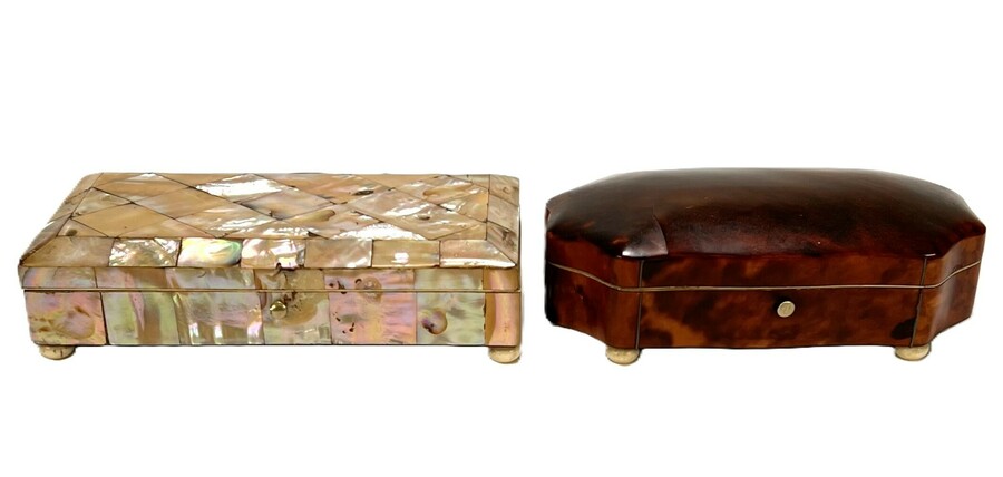 Stel doosjes uit de Art Deco periode, vervaardigd uit parelmoer en tortoise met ingelegde en gepolijste oppervlakken. Een doosje toont een rechthoekig corpus met ruitvormig parelmoerpatroon, het andere doosje een afgeronde vorm met tortoise. Beide doosjes rusten op kleine bolpootjes en zijn voorzien van messing scharnieren. Datering eerste helft 20e eeuw en een Europese herkomst.