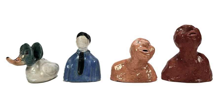 Beeldjes vervaardigd uit keramiek en terracotta met handgevormde modellering en deels glazuurafwerking. Het kavel omvat een vogel met blauwgroene kop en oranje snavel (gedateerd 2023), een gestileerde mannenbuste met blauwe mantel en zwarte das, en twee rudimentair gemodelleerde hoofden in roodbakkende klei door Grietje Hoving.