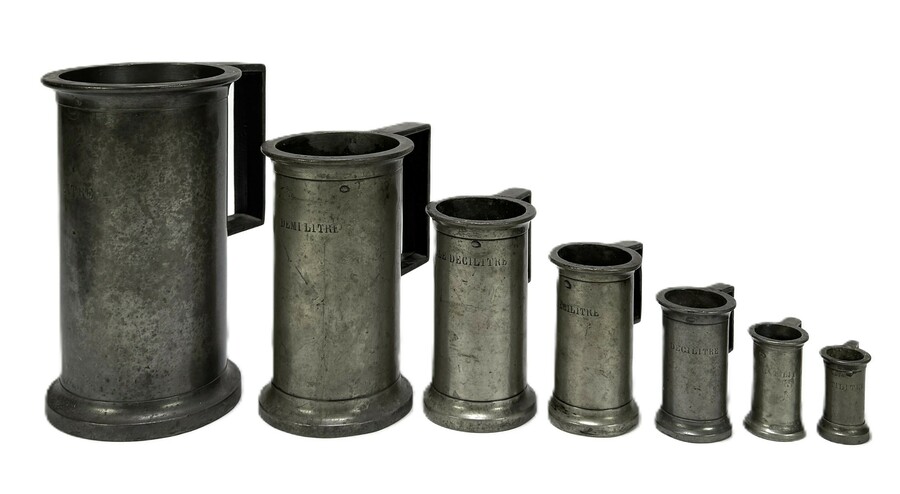 Stel Biedermeier tinnen maatbekers vervaardigd uit gegoten tin met gegraveerde volume-aanduidingen. De reeks omvat zeven maten van liter tot centiliter, elk voorzien van een karakteristiek haaks oor en ijkstempels langs de rand. De onderzijde toont het gietersmerk van R.G., daterend omstreeks 1880 en een Franse herkomst.