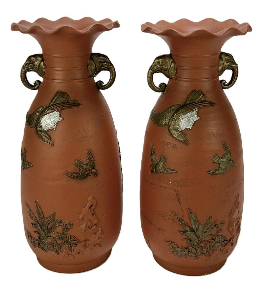 Vazen van Tokoname uit de Meiji-periode, vervaardigd uit ongeglazuurd terracotta met decors in hoog reliëf. De vazen tonen gedetailleerde voorstellingen van vliegende vogels en chrysanten, geaccentueerd met een metaalachtige patina. Kenmerkend zijn de handgrepen in de vorm van olifantenkoppen en de geschulpte mondingsranden. Gemerkt met een Japans zegelstempel, de vazen dateren uit circa 1900 en hebben een Japanse herkomst.