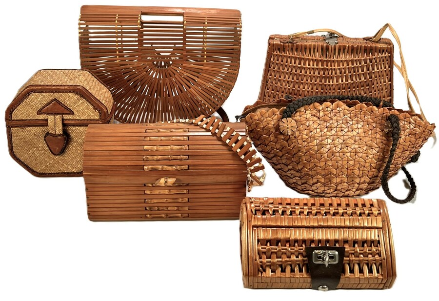 Stel tasjes vervaardigd uit bamboe, riet en rotan met diverse vlechttechnieken. De collectie bevat een waaiervormig bamboe model, een achthoekig gevlochten kistje met lederen montuur en diverse handtasjes met metalen sluitingen. De collectie dateert uit het midden van de 20e eeuw en heeft een herkomst in Zuidoost-Azië en Europa.