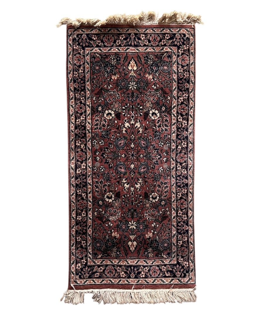 Kleed uit het Hamadan district, midden 20e eeuw, vervaardigd met de symmetrische knoop in wollen pool op katoenen inslag. Het kleed toont gestileerde geometrische en florale motieven op een karakteristieke meekrap rode grond. De compositie wordt omlijst door meerdere borders in indigo en crème met accenten van zachtgroen. Het kleed heeft een Noordwest-Perzische herkomst.