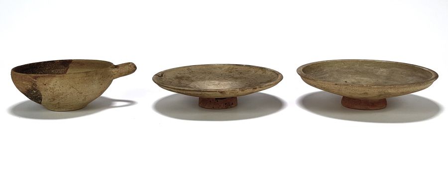 Hellenistisch aardewerk gedateerd 2e eeuw v. Chr. tot 1e eeuw n. Chr., Middellandse Zeegebied. De set omvat twee ondiepe patera-vormige schalen op een geprononceerde standring en een drinkkommetje met een oor uit beige terracotta. De voorwerpen vertonen concentrische draaisporen en een oppervlak met minerale afzettingen en aard aankoeksel. Herkomst uit een Europese privécollectie.