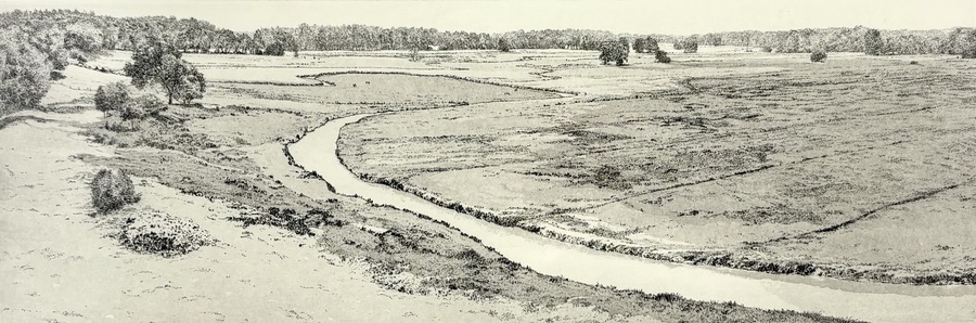Ets door Reinder Homan (1950) toont een panoramisch landschap van De Drentsche Aa in realistische stijl, uitgevoerd op papier. Gesigneerd en gedateerd linksonder, met oplagenummer E.A. 29/100 rechtsonder. De ets dateert uit 2008 en heeft een Drentse herkomst. Gemonteerd in een houten lijst.