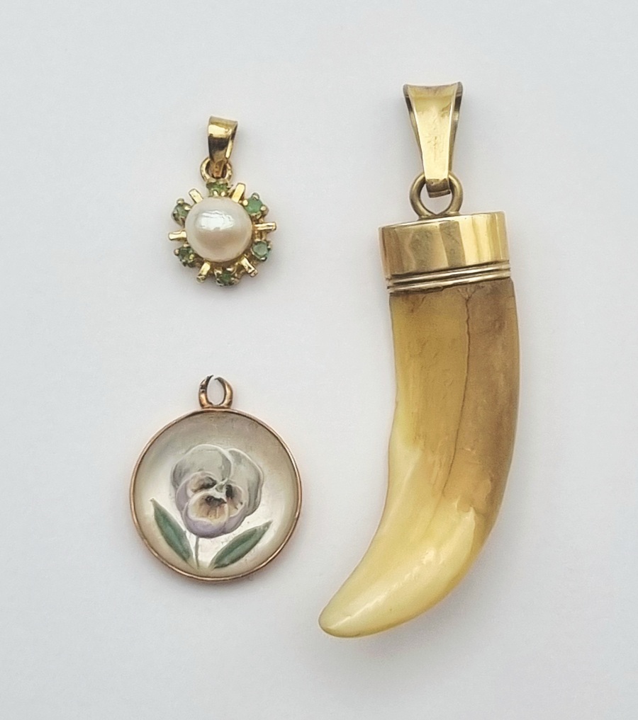 Hangers in getoetst 14-karaats goud en 585 goud, bestaande uit een tijgertandhanger met gouden montering, een ronde hanger met geëmailleerde bloem en een hanger met centrale parel, omgeven door kleine groene stenen. Datering tweede helft 20e eeuw.