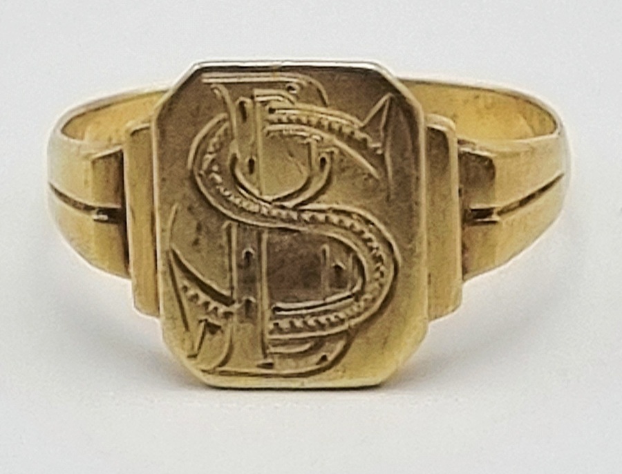 14 karaat gouden zegelring met een achthoekige platte kop. De buitenzijde is voorzien van een gegraveerd monogram met de initialen SB in gestileerd schrift, gemerkt met het Nederlandse eikenblad voor 585 goud en bevat een naamsvermelding aan de binnenzijde. Het ontwerp dateert uit het midden van de 20e eeuw.