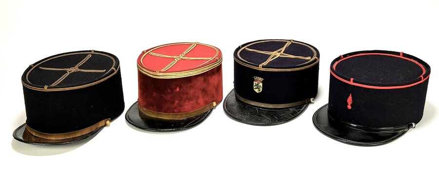 Vier kepies bestaande uit één pompier kepie en drie militaire kepies, vervaardigd uit wol en vilt met lederen kleppen en cannetille-borduurwerk. De hoofddeksels hebben cilindrische vormen met vlakke bovenzijden en koorddecoraties in kruisvorm. Kleurstellingen omvatten rood met goudkleurige biezen en donkerblauw met contrasterende afwerkingen. De set omvat diverse Franse modellen, waaronder een officieruitvoering met gouden galon en een Sapeurs-Pompiers kepie met rode biezen. Datering eerste helft 20e eeuw.