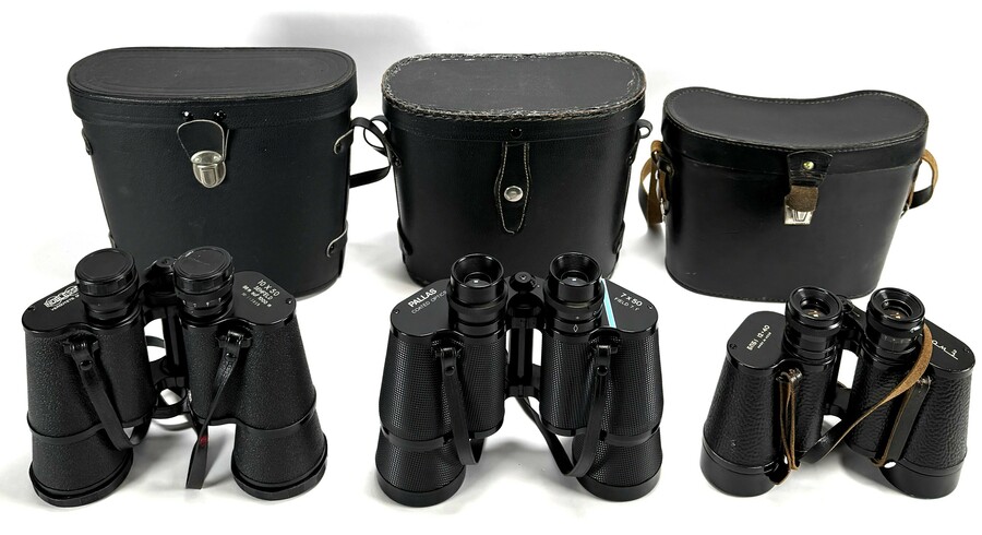 Drie verrekijkers van Noblesse, Pallas en ZOMZ, vervaardigd uit metaal en kunststof met gecoate optiek. De kavel omvat een Noblesse 10x50, een Pallas 7x50 en een Russische ZOMZ 12x40 met originele kunstleren opbergtassen. De verrekijkers dateren uit de periode 1970–1980 en hebben een Europese herkomst.