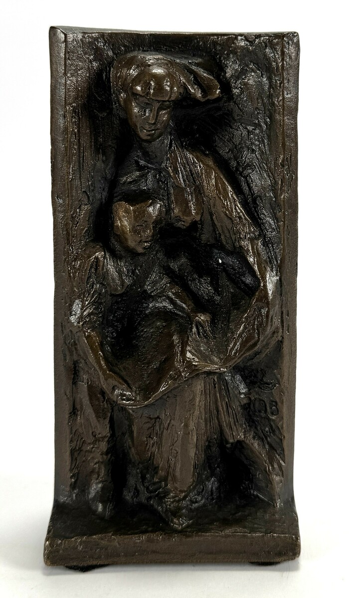 Tweezijdig bronzen beeld in modernistische stijl, vervaardigd uit brons met gegoten reliëf op een smalle, staande plaquettevorm. Aan weerszijden zijn geabstraheerde figuren in diepe, ruwe modellering weergegeven, waaronder een vrouwelijke figuur met kind. Gemerkt ‘B 50 G’ op de ene zijde en ‘95’ op de andere. Dit beeld dateert uit 1995 en heeft een Europese herkomst.