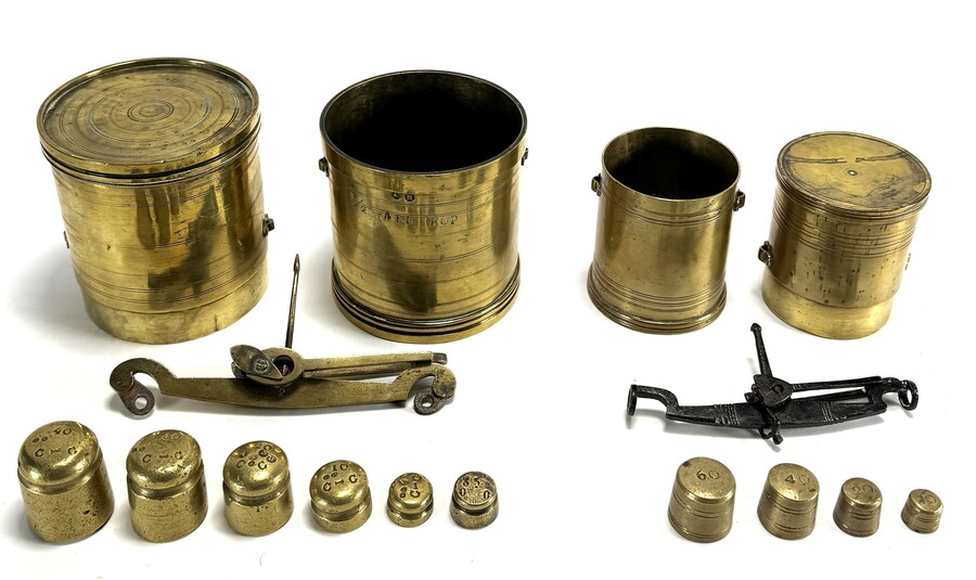 Messing graanbalans en balansgewichten in utilitaire stijl, vervaardigd uit messing met gedraaide en gegraveerde cilindrische maatbussen met concentrische ringen, losse gewichten en twee balansarmen. De grotere bus is gemerkt 1/2 NED KOP, een Nederlands maatsysteem voor korenhandel. Daterend 19e eeuw en een Nederlandse herkomst.