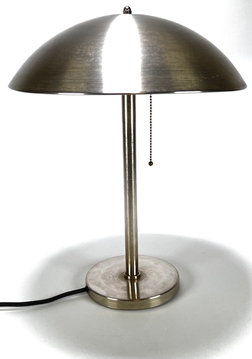 Bureaulamp van IKEA in moderne stijl, vervaardigd uit geborsteld metaal. De lamp heeft een halfronde kap op een slanke cilindrische stam, rustend op een platte ronde voet. Fabriekssticker op de binnenzijde van de armatuur. De lamp dateert uit circa 1995 en heeft een herkomst in Zweden.