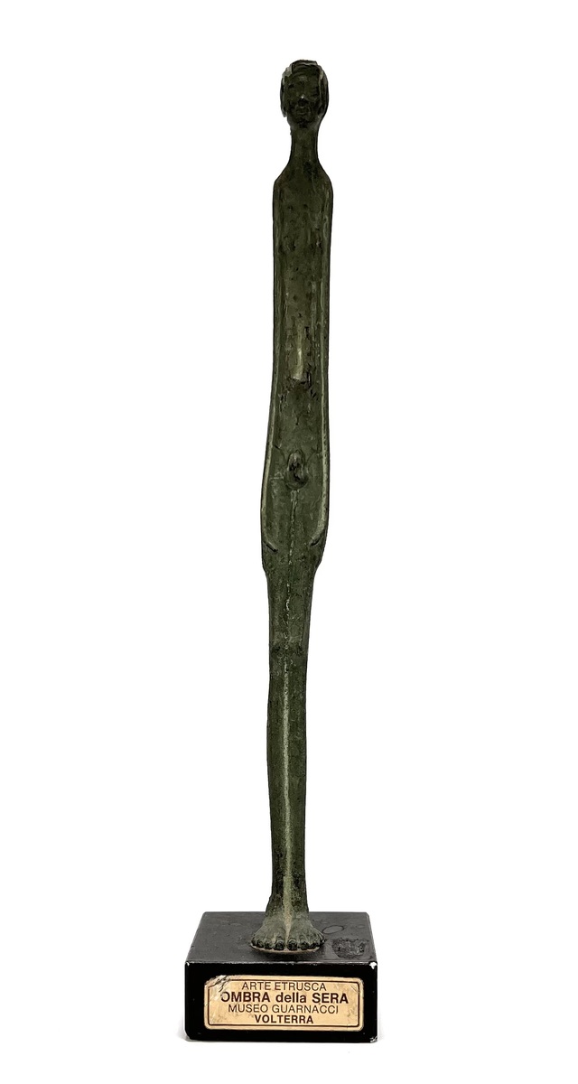 Beeld van Museo Guarnacci in modernistisch-primitivistische stijl, vervaardigd uit gepatineerd brons op een stenen voet. Het beeld toont een sterk verlengde mannelijke figuur naar het archeologische origineel 'Ombra della Sera'. Label op de voet met herkomstvermelding uit Volterra, het object dateert uit ca. 1970 en heeft een Italiaanse herkomst.