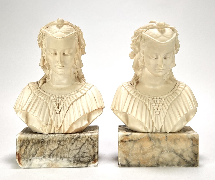 Bustes in neoclassicistische stijl, vervaardigd uit gegoten composiet op rechthoekige natuurstenen sokkels. Uitgevoerd naar het bekende Angelica Maria-model van A. Giannelli en toont vrouwelijke bustes met neerwaartse blik, opgestoken haar met lintornamenten en een geplooide schouderpartij. De reproducties dateren uit de tweede helft van de 20e eeuw en hebben een Europese herkomst.