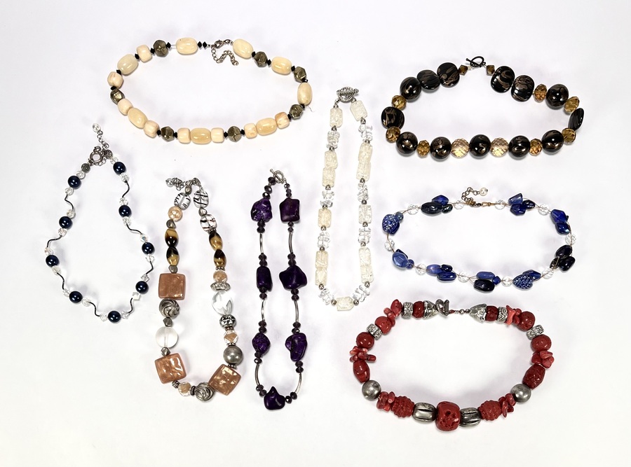 Kettingen van glas en kunststof in een gevarieerde samenstelling. De collectie bevat exemplaren met amethistkleurige elementen, imitatiekoraal en gefacetteerde glaskralen in diverse tinten. De ontwerpen variëren van enkelvoudige strengen tot meervoudige snoeren met metalen accenten. Datering eind 20e eeuw.