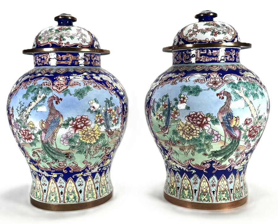 Een paar grote Chinese dekselpotten in famille rose stijl, vervaardigd in emaille tijdens de late Qing-dynastie, 19e eeuw. Het gespiegelde decor toont kleurrijke fazanten op rotspartijen te midden van pioenrozen en bloesems tegen een lichtblauwe fond, donkerblauwe rolwerkranden met florale medaillons sieren de hals en voet. Polychrome bloemenmotieven op de deksels. Chinese export voor westerse markt.