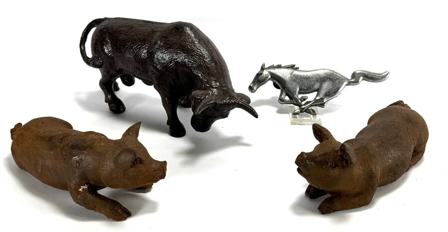 Drie gietijzeren dierfiguren; een krachtig gemodelleerde stier in aanvalshouding, twee rustieke liggende varkens met een karakteristieke bruine oxidatiepatina. Hierbij het iconisch logo 'Running Horse' van de Ford Mustang uit de jaren zestig. Datering 20e eeuw.