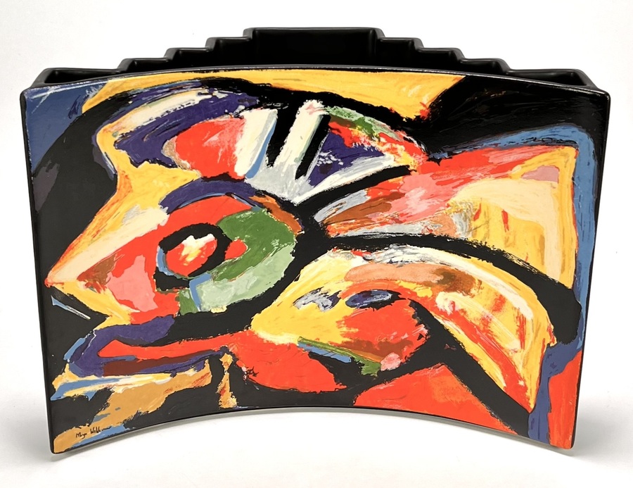 Vaas van Royal Goedewaagen naar ontwerp van Anne de Hoop en Maya Wildevuur (1944–2022), uit de postmoderne periode, vervaardigd uit aardewerk met handbeschilderd abstract expressionistisch decor op matzwarte glazuur. De vormgeving combineert een gebogen voorzijde met een getrapt corpus. Gemerkt aan de onderzijde met fabrieksstempel, jaartal 1994 en oplagennummer 41/250. De vaas heeft een Nederlandse herkomst en inclusief origineel certificaat.