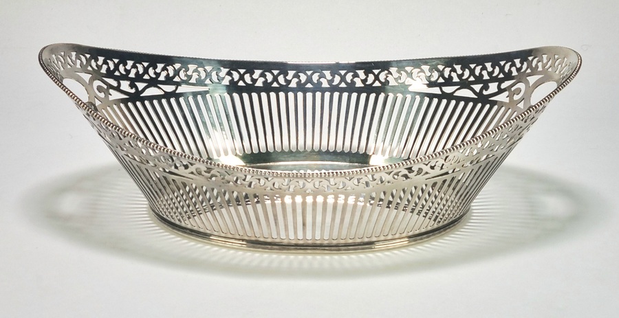 Zilveren tweede gehalte bonbonmandje vervaardigd te Amsterdam. Het ovale model toont fijn ajour zaagwerk met geometrische cirkelmotieven en gestileerde florale elementen. De bovenzijde is afgewerkt met een parelrand en strikvormige handgrepen, het geheel rust op vier bewerkte pootjes. Voorzien van Nederlandse keuren: meesterteken J2P, lopende leeuw 2, stadsteken en jaarletter Z (1909).