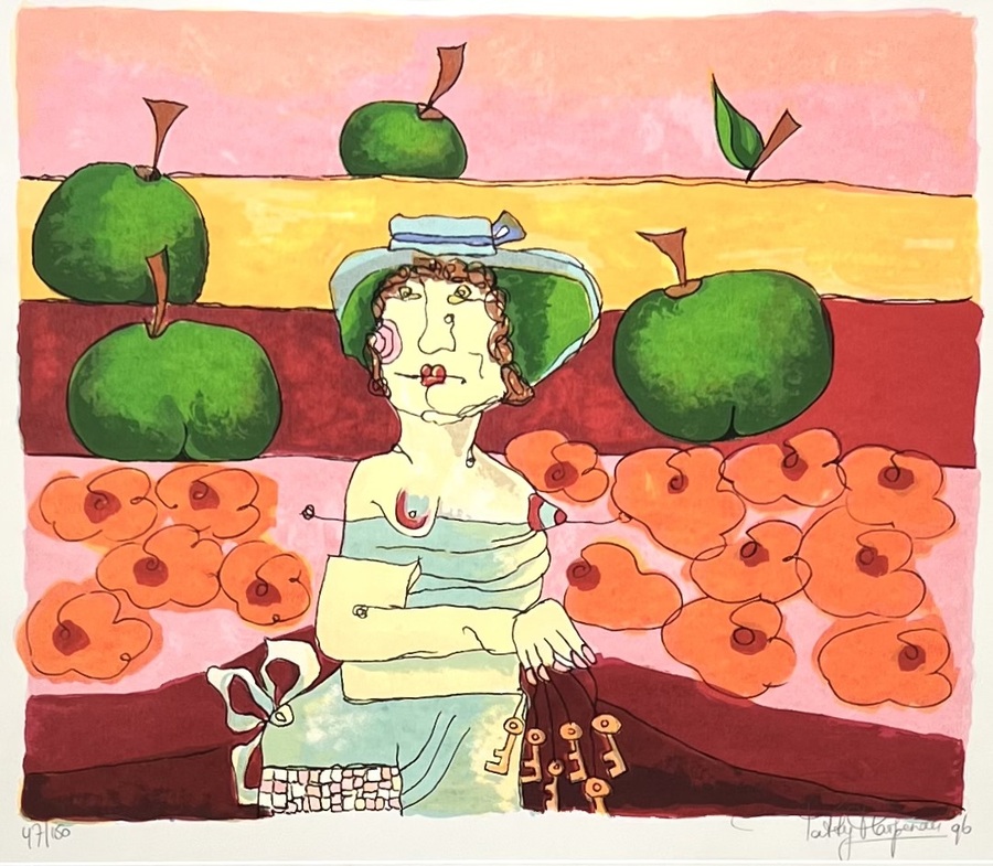 Zeefdruk door Patty Harpenau (1959) toont een geabstraheerde vrouw met hoed en sleutels tegen een decor van gestileerde appels in modernistische stijl, uitgevoerd in meerkleurige zeefdruk op papier. Gesigneerd en gedateerd rechtsonder, oplagenummer 47/150 linksonder, verso informatie. Deze zeefdruk dateert uit 1996 en heeft een Nederlandse herkomst.