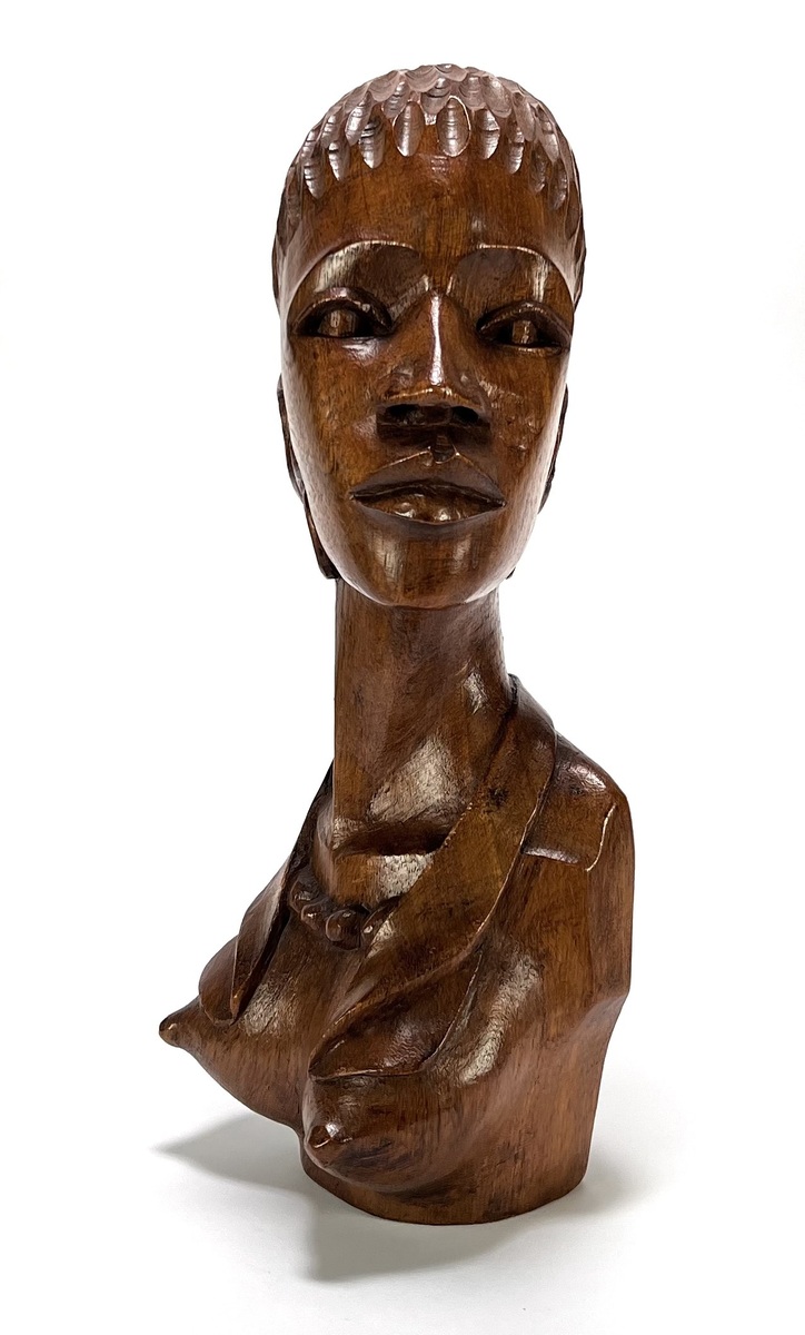 West-Afrikaanse houten buste uit de postkoloniale periode, ca. 1970, uitgevoerd in handgesneden hardhout met een donkere gepolijste afwerking. De vrouwelijke figuur toont een langgerekte hals, amandelvormige ogen en een gestileerde coiffure met repetitieve lineaire inkepingen. Het beeld is versierd met uit het hout gesneden kralenketting en ronde oorringen.