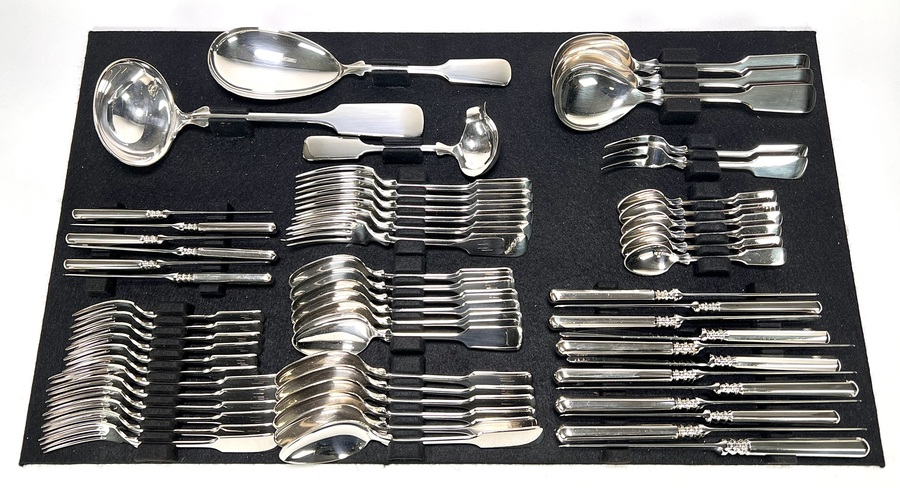 Bestek van Robbe & Berking (opgericht 1874), vervaardigd uit 925 zilver, Duitsland, tweede helft 20e eeuw. De zesdelige set bestaat uit lepels, vorken, messen en opdienbestek, achterzijde gegraveerd “HJ”. Gemerkt met 925, halve maan, kroon en meesterkeur R&B.