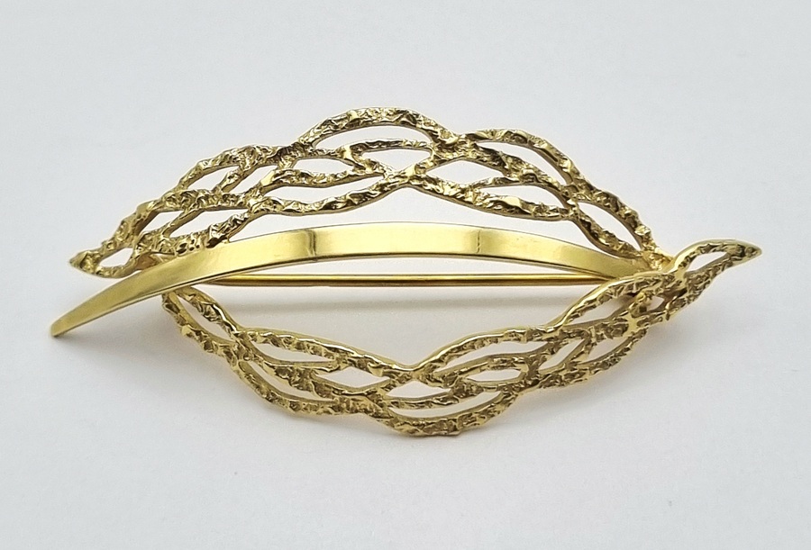 Gouden 14-karaats broche uitgevoerd in een modern stijl, daterend tweede helft 20e eeuw. Het sieraad toont een abstract ontwerp waarbij de opengewerkte zijden zijn voorzien van organische textuur. De centrale gepolijste baan vormt een contrast met de bewerkte randen. De geelgouden broche is aan de achterzijde voorzien van het 585 goudkeurmerk.