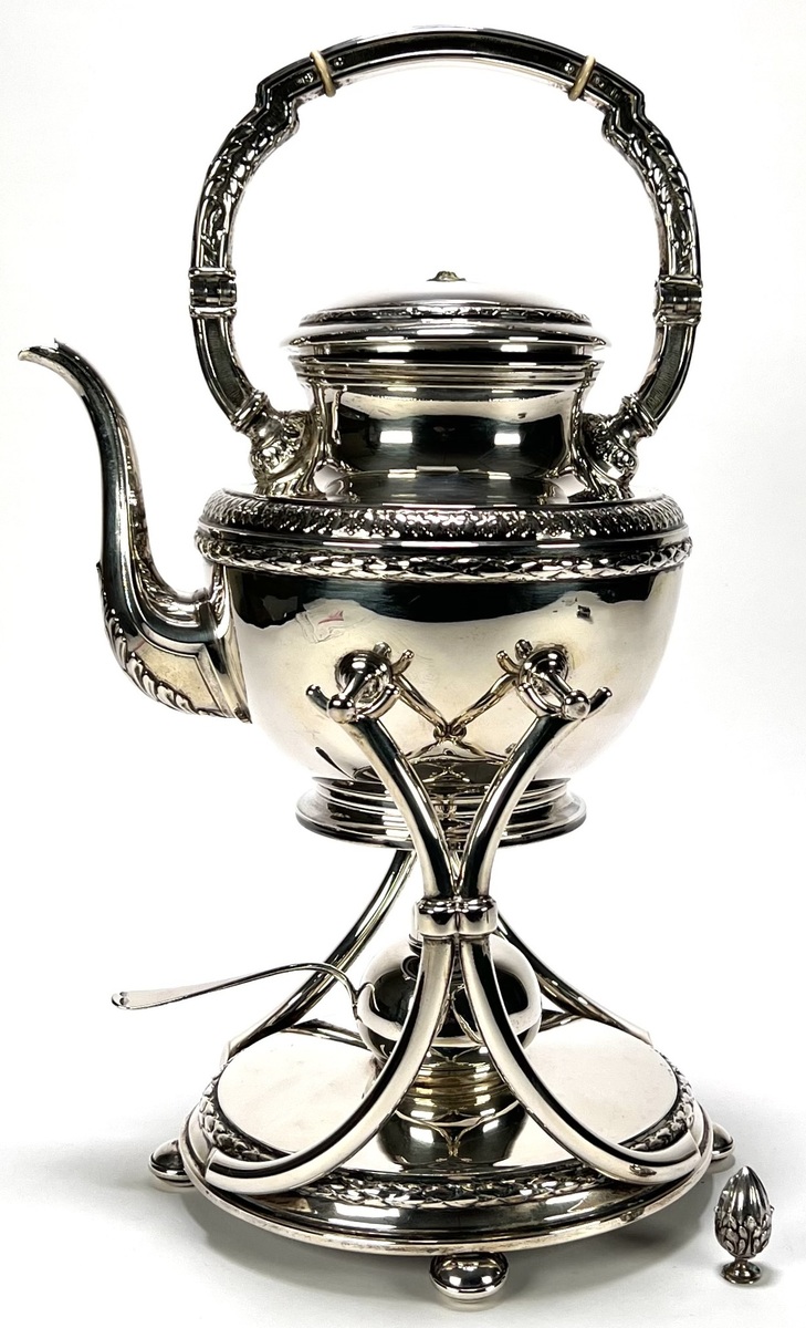 Zilveren bouilloire, waterketel met komfoor en brander, Mexico, midden 20e eeuw. De bolle ketel hangt in een opengewerkt standaard op bolvoeten en is voorzien van een hoog opgetrokken tuit, scharnierend hengsel en losse brander. Rand en aanzetten tonen gegoten bladornament. Gemerkt met Mexicaanse adelaar 3, initialen MR en gehaltestempel 916/1000.