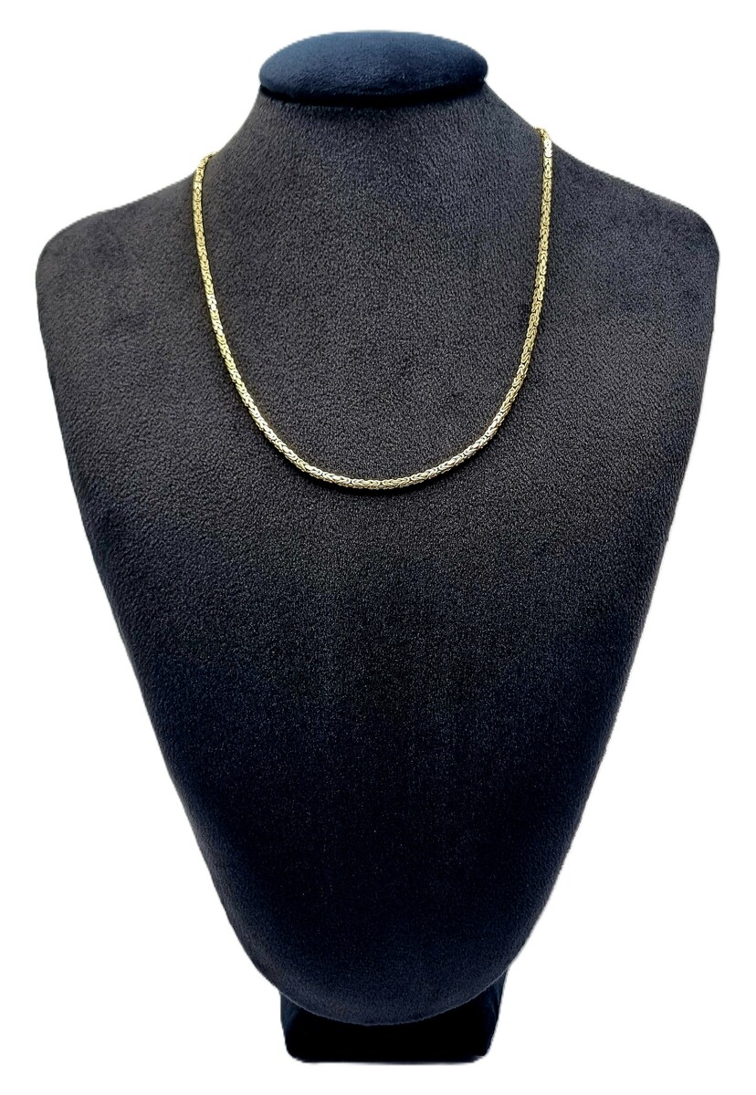 Gouden halsketting van 14-karaats goud, uitgevoerd als koningsschakel met dicht gevlochten, regelmatig opgebouwd schakelpatroon en karabijnsluiting. Gemerkt 585, datering eind 20e eeuw.