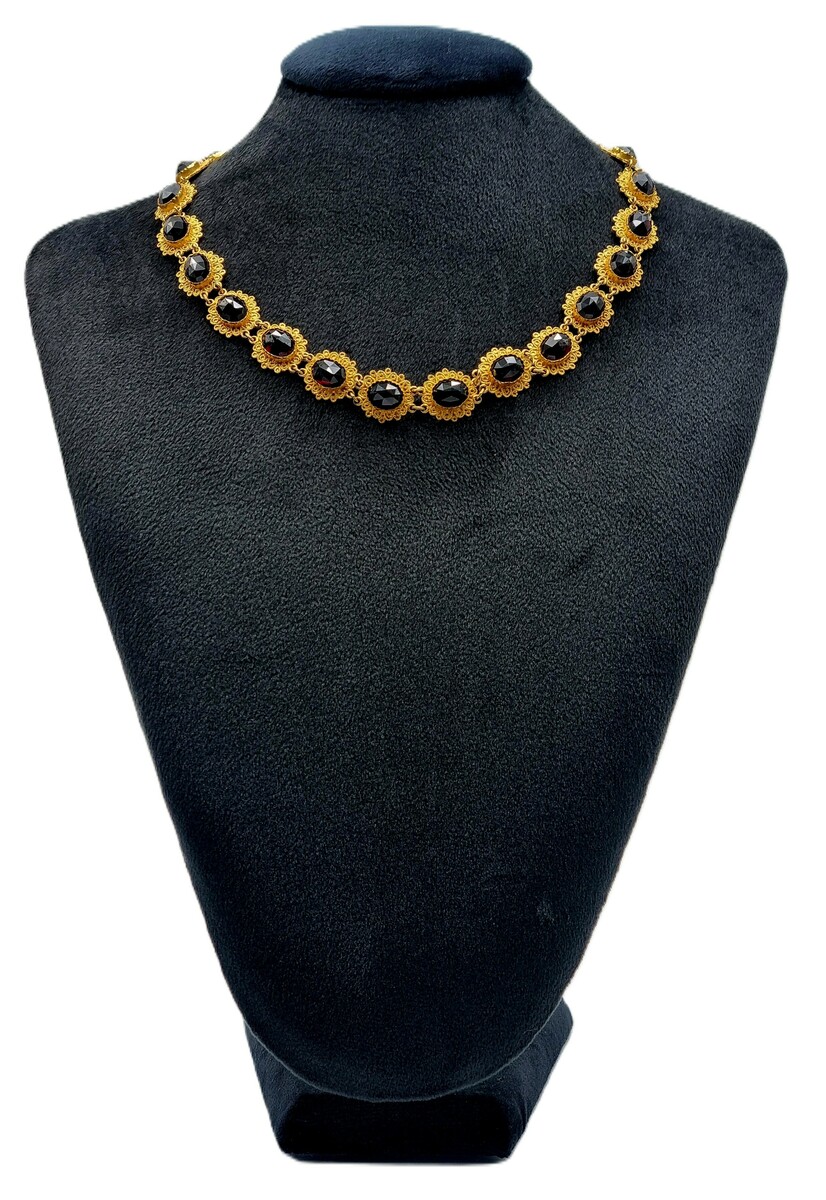 Gouden 14-karaats ketting uitgevoerd met achttien gefacetteerde granaten in rozetslijpsel. Elke steen is gevat in een bewerkt filigrain montuur, onderling verbonden door dubbele oogschakels. De sluiting betreft een bakslot met veiligheidsketting, voorzien van het Nederlandse eikenbladkeurmerk voor 585 goud. Datering 20e eeuw.