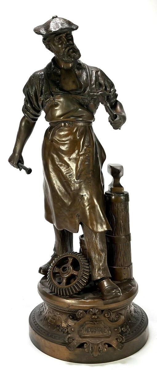 Beeld van Arthur Waagen (1833–1898) uit de belle-époque periode, vervaardigd uit wit metaal met een meerkleurige bronskleurige patina middels giettechniek. De naturalistische voorstelling toont een bebaarde arbeider met hamer en tang naast een aambeeld, ton en tandwiel. Op de gedecoreerde sokkel bevindt zich een cartouche met opschrift Industrie. Dit beeld dateert uit circa 1890 en heeft een Franse herkomst met een leesbare signatuur.